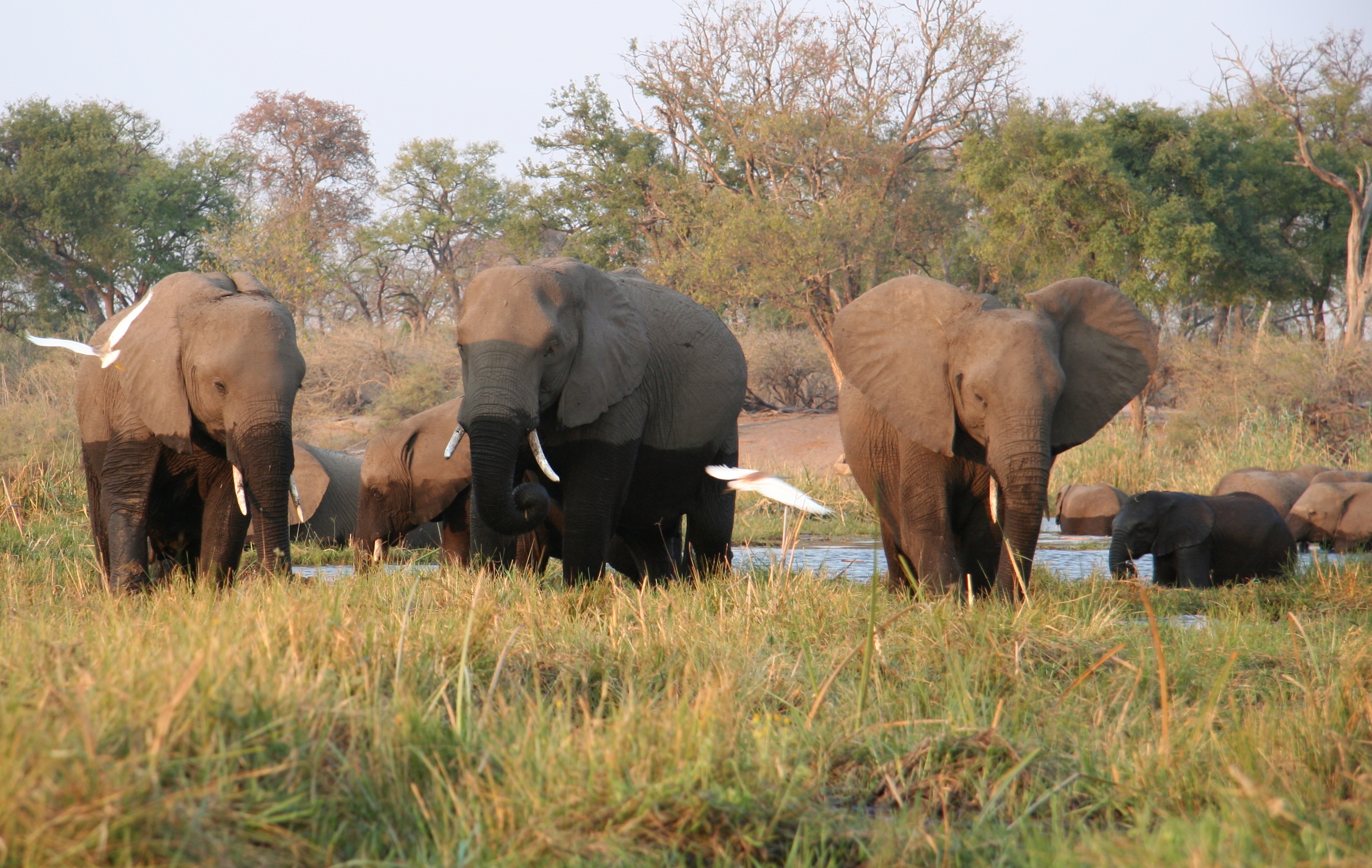 We’d floated silently in canoes in a Linyati River marsh, a blissful ending to a magic-filled day. During the evening “sundowner” we’d watched a family of ellies teaching a baby how to feed itself. He’d been completely submerged, holding his trunk up like a periscope, while the older ones were wet only to their bellies.