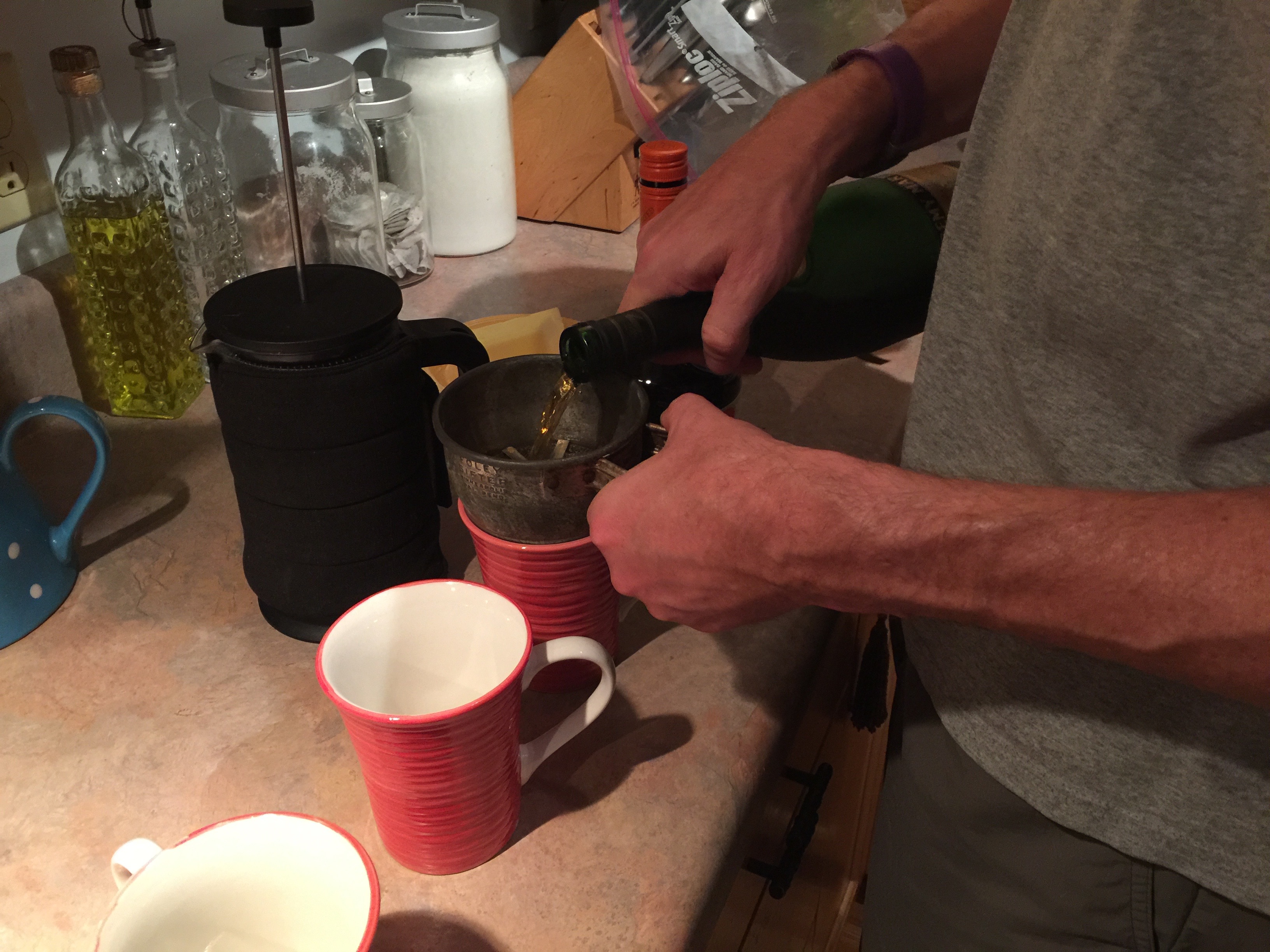September 5, 2016 IMG_3905 Published at 3264 × 2448 in Dark shadows brilliant weekend. Martin uses flour sifter to strain cork out of his coffee and brandy.