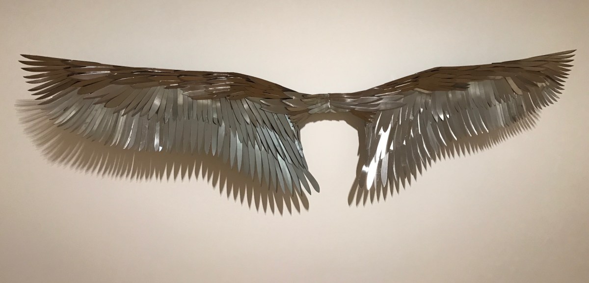 July 11, 2017 IMG_0573 Published at 3906 × 1878 in A ‘peak’ at a perfect day. “Aerialist,” 10′ wide wings made of knife blades, depicts risks of flight..