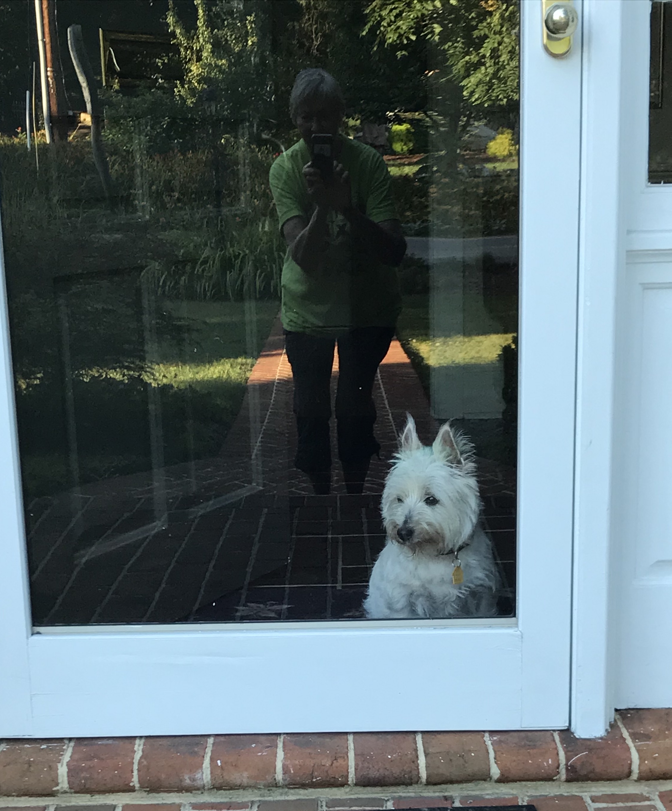 July 25, 2020 IMG_5607 Published at 2261 × 2726 in Tales that wag the dogs. Pippa watches while I collect the newspaper.